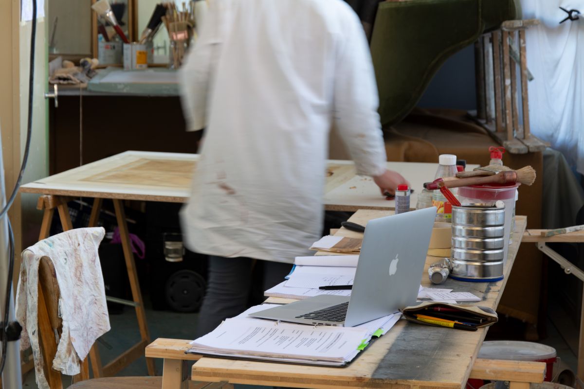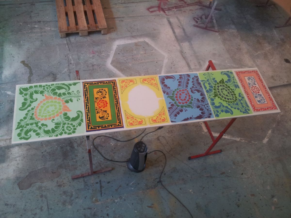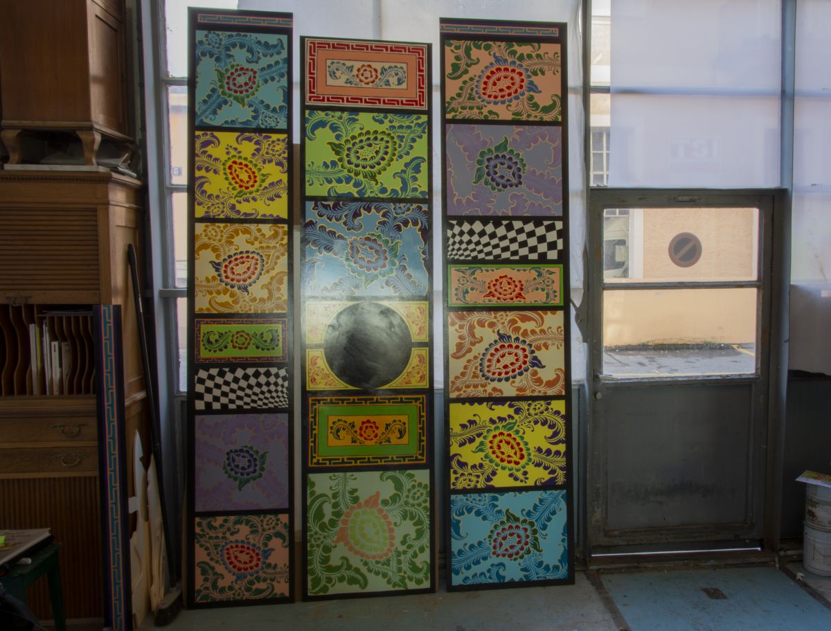 Sur la base des plans réalisés sur Sketchup, la construction a été confiée à Pierre-Alain Visinand à Crissier. Il nous a fourni, à Lola Sacier et moi même les plateaux des façades à peindre. Soyons clairs, pas d'impression ici, ni de sérigraphie. D'abord les plateaux en mdf ont reçu plusieurs couches de fond d'accrochage. Puis vient l'application de deux couches de peinture pour la couleur de fond de chaque "bloc". Ensuite, les motifs ont été décalqués au papier carbone. Chaque élément est peint à la main à l'acrylique (deux couches à chaque fois). Et finalement, les bordures noires ont été peintes pour encadrer les motifs. Un travail de fourmi sur une dizaine de jours. Et une grande pensée solidaire pour certains ouvriers asiatiques qui doivent répéter, eux, des gestes artisanaux tout au long de l'année. Pour la manipulation du bloc central et en clin d’œil aux références d'origine, j'ai trouvé chez un fournisseur une espèce de volant métallique évoquant ces fameuses armoires à archive. Une fois vernis, les panneaux ont été récupérés par Pierre-Alain qui s'est chargé du montage final chez les clients.