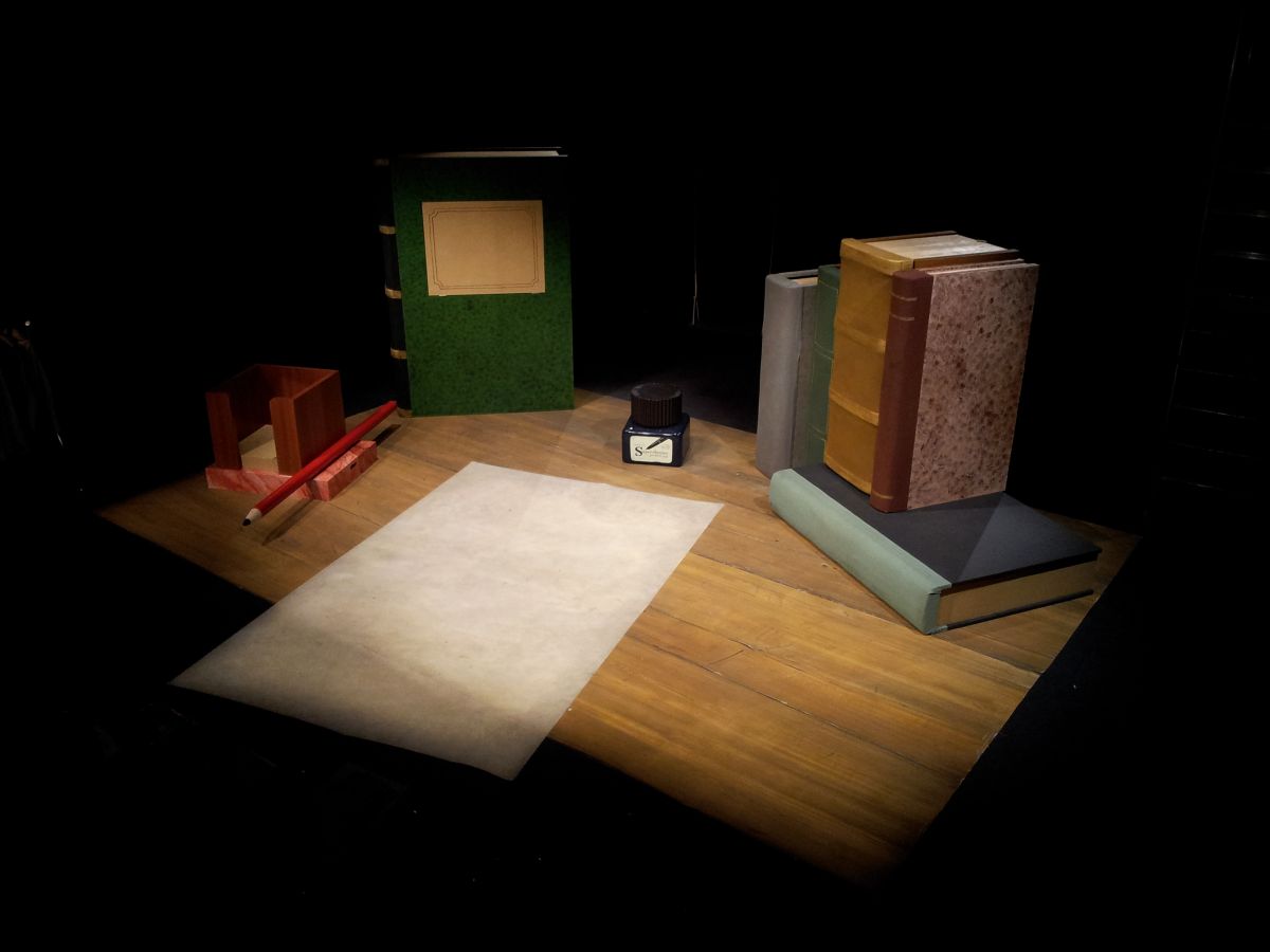 Dès le départ nous avons écarté l'idée d'un décor réaliste immersif. Pourtant, j'avais envie d'évoquer l'univers de l'auteur, la salle de classe, le bureau, les livres. Un univers de papier et de pensées. Les contraintes techniques étaient que le décor allait tourner dans plusieurs lieux, qu'il devait offrir plusieurs espaces de jeu possibles et réserver son lot de surprises. Assez vite j'ai envisagé l'idée d'un dessus de bureau agrandi et géant.